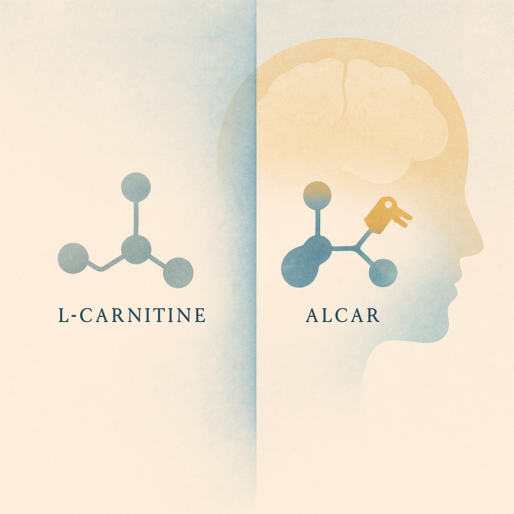 A acetil-L-carnitina (ALCAR) é uma versão premium da l-carnitina — consegue chegar ao cérebro, enquanto sa parente fica restrita aos músculos transportando gorduras. No cérebro, a ALCAR fornece combustível direto às mitocôndrias neuronais - a teoria é sólida, mas a prática tem ressalvas importantes.