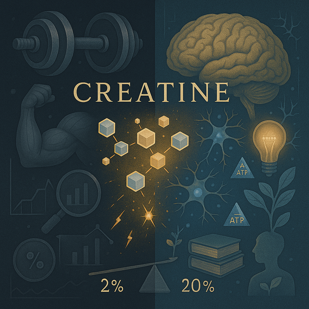 Mais conhecida das academias do que das bibliotecas, a creatina tem uma faceta cerebral pouco divulgada. Secretamente, turbina cérebros com uma eficácia que deixaria muitos nootrópicos "oficiais" no chinelo. A creatina funciona como uma "bateria reserva" celular - reabastece rapidamente as reservas de ATP (a moeda energética universal) tanto nos bíceps quanto nos neurônios. Isso é energia rápida útil para momentos de alta demanda metabólica. Isso é particularmente relevante porque o cérebro, embora pese apenas 2% do corpo, consome cerca de 20% da energia.