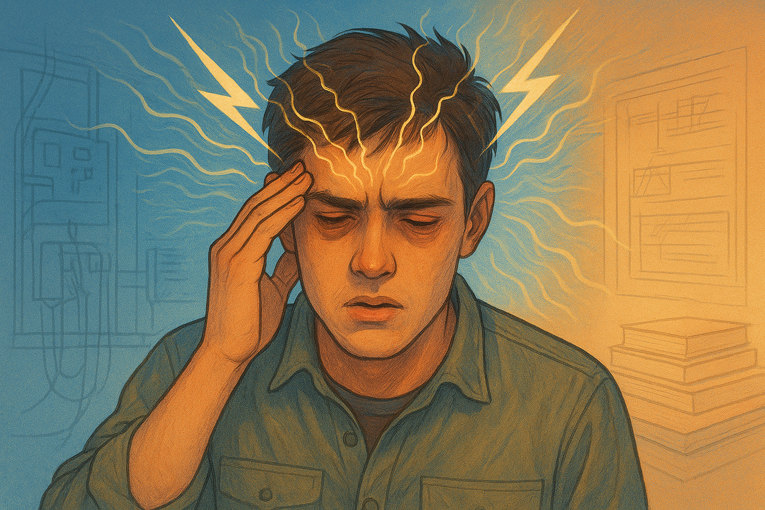 Pela manhã, no trabalho, os primeiros sinais. As luzes pareciam mais intensas, mais claras que o normal. Depois veio a náusea, aquele mal-estar visceral que anuncia tempestade. E então a dor - pulsátil, nas têmporas, com uma sensibilidade insuportável aos sons. Fonofobia. Enxaqueca clássica disparada por estresse e privação de sono.